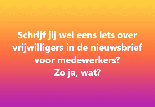 Huub van Dommelen2023-08-18 22:04:132025-07-11 07:06:58Schrijf jij wel eens iets over vrijwilligers in de nieuwsbrief voor medewerkers? Zo ja, wat?