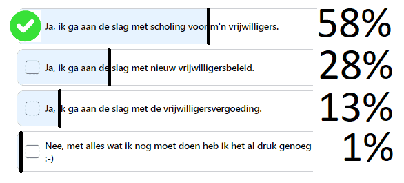 In de Facebookgroep Vrijwilligerscoördinatie hebben we begin dit jaar een poll gehouden: “Begin v/h nieuwe jaar! Ga jij nog iets extra’s oppakken rond je vrijwilligers?” Dit is de uitslag:
