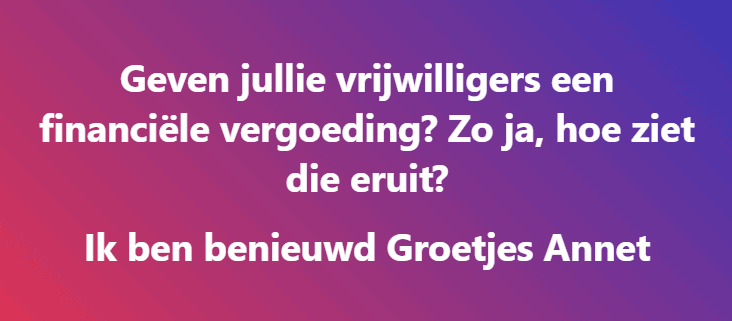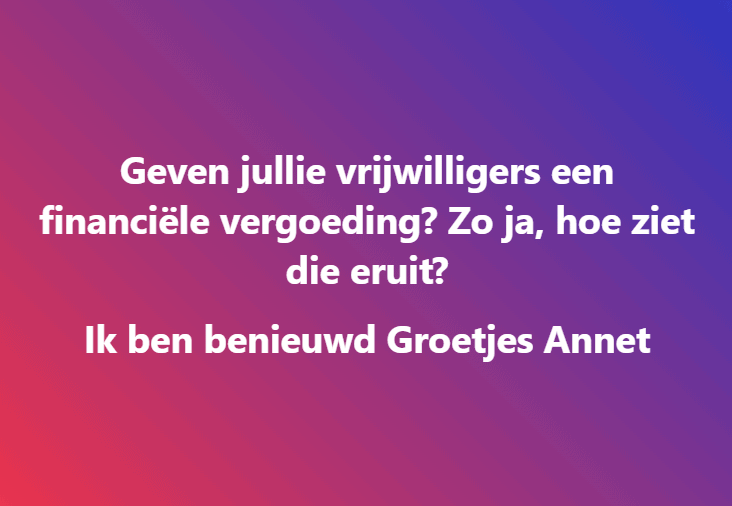 Vraag: geven jullie vrijwilligers een financiële vergoeding? Zo ja, wat?