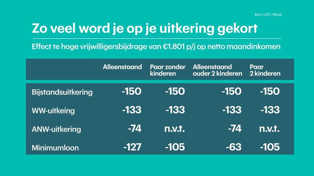 Komt iemand boven het plafond, dan moet er inkomstenbelasting worden betaald over de totale vrijwilligersvergoeding. Iemand die een bijstandsuitkering heeft en 1 euro per jaar te veel vrijwilligersvergoeding ontvangt, moet vervolgens een jaar lang 150 euro per maand van de uitkering terugbetalen, blijkt uit de berekeningen van LCR en Nibud.